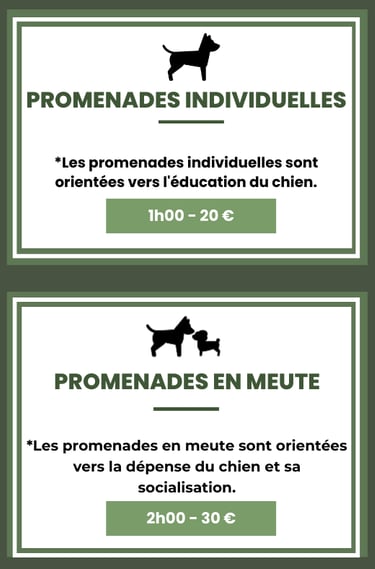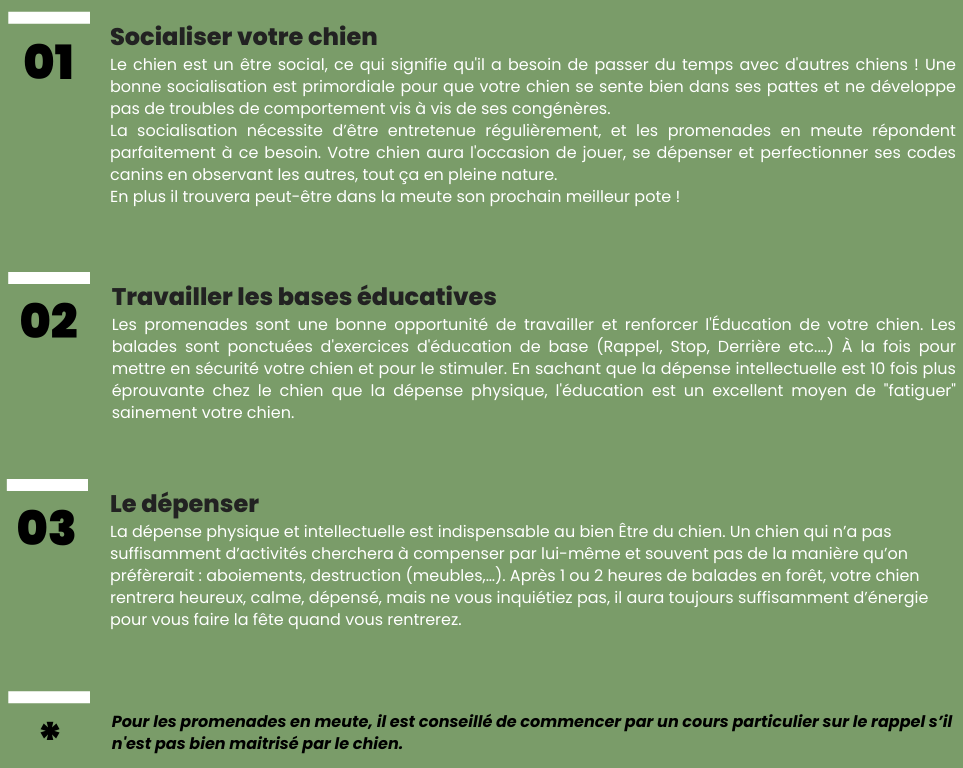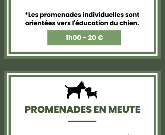Je propose un service de promenades en forêt pour répondre à la fois aux besoins de vos chiens, mais aussi aux besoins des propriétaires qui sont souvent trop occupés pour dégager suffisamment de temps pour leur compagnon à quatre pattes.